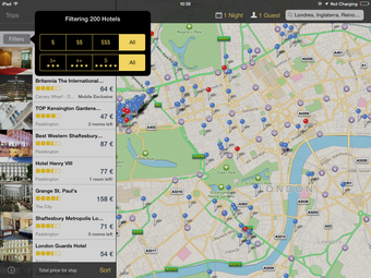 Expedia Hotels & Flights référence plus de 130 000 hôtels dans le monde dont vous pouvez vérifier les disponibilités en temps réel. Vous pouvez trouver les hôtels autour de vous en activant la géolocalisation ou effectuer une recherche et taper le nom d'un hôtel que vous connaissez. Comme pour les vols, l'application propose des options de filtrage et de classement bien utiles: tarifs, popularité, nombre d'étoiles, notes et avis des voyageurs, etc.